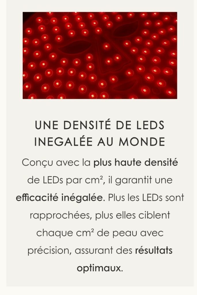 Ce masque possède aussi une puissance inégalée qu’on ne retrouve chez aucune marque concurrente puisqu’il a une irradiance de 50mw/cm² du coup on peut ne l’utiliser qu’une fois 30 minutes par semaine et c’est suffisant pour obtenir des résultats sur l’action anti-âge !